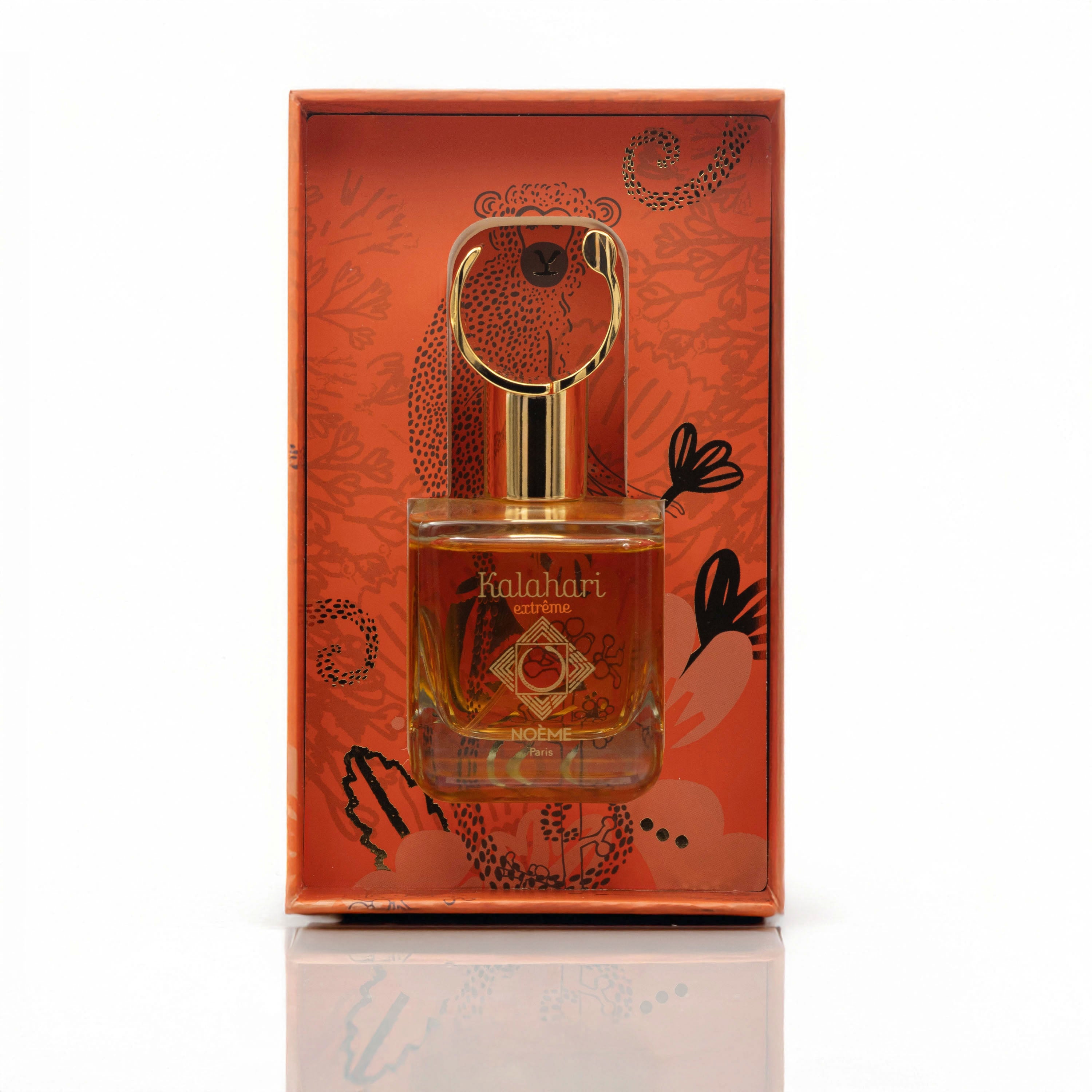 Kalahari Extrême s’ouvre sur une envolée scintillante de poire juteuse, relevée par la vivacité de l’anis et l’éclat lumineux de l’orange, évoquant les premières lueurs du soleil caressant les dunes infinies du désert. Le cœur se déploie ensuite dans un accord riche et captivant : cèdre de Virginie, myrrhe précieuse, noix de muscade chaleureuse, poivre rose vibrant et cardamome raffinée s’entrelacent pour créer une profondeur boisée et épicée, évoquant la chaleur et la majesté du désert.